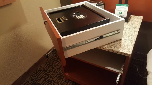 Этот сейф в гостиничном номере прикреплен болтами к выдвижному ящику