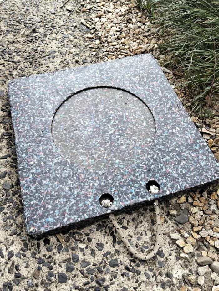 Пластиковый квадрат с отверстиями на обочине дороги