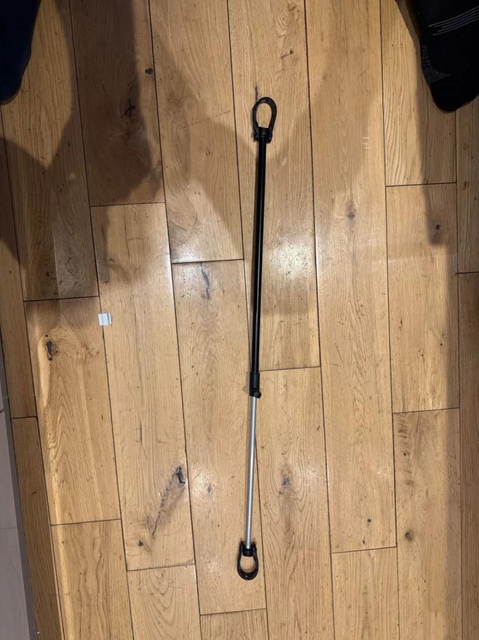 Длинная, тонкая, раздвижная металлическая палка с резиновыми петлями на обоих концах, обнаружена дома