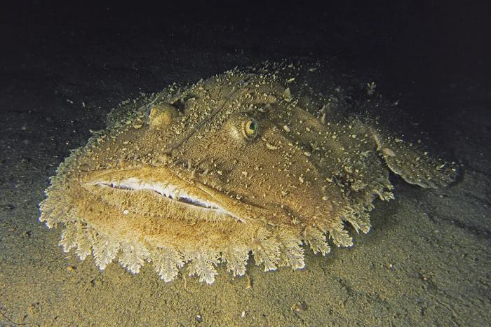 Если не считать мускулистых плавников, остальные элементы тушки выглядят невыразительным придатком. Но в этом и суть! Чёрт не спешит показываться из табакерки. Пёстрая окраска под цвет местного дна и отростки-бахрома по всему телу — в таком камуфляже рыб остаётся инкогнито среди каменистых уступов и зарослей водорослей на глубинах до километра.