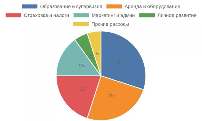 Теперь, чтобы наглядно показать, как распределяются расходы психолога, взгляните на эту диаграмму. Она иллюстрирует типичную структуру затрат для специалиста в российском городе.