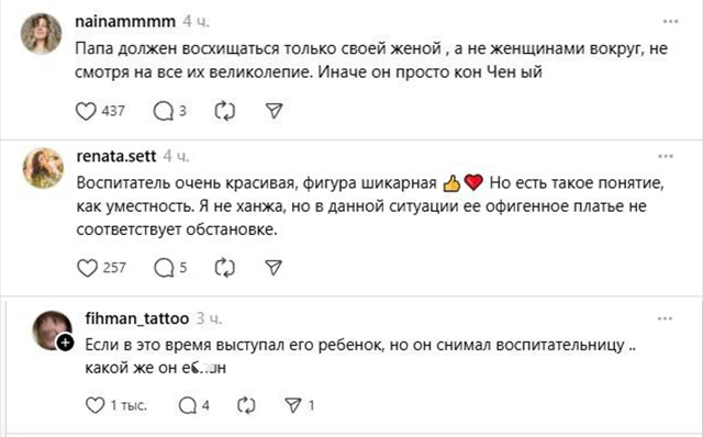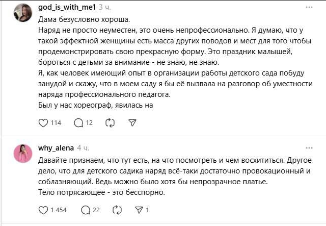 Кто-то из пап заметил на утреннике в детском саду яркую воспитательницу, которая произвела впечатление. В комментариях сразу началась дискуссия о её наряде и его уместности.