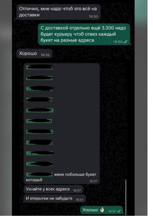 Мужчина потратил 60 тысяч рублей на 11 букетов, каждый из которых был украшен надписью «ты - моя самая любимая и единственная». Самый большой - для жены, а остальные - для своих девушек.