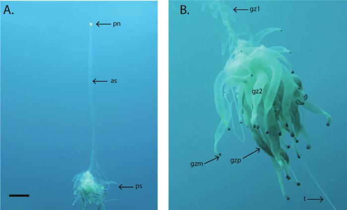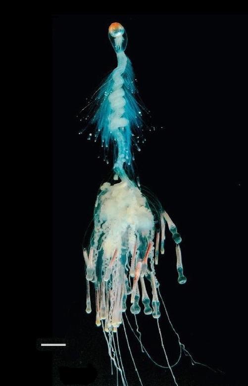 Как и всё живое, батифиза начинает свой путь с одной-единственной оплодотворённой клетки, зиготы. Через недельку-другую зигота развивается в свободно плавающую в толще воды личинку. Какое-то время она дрейфует по течению и набирается сил, после чего начинается биологическая магия. Личинка создаёт точную копию себя, а затем вторую, третью, четвёртую... Да, некоторые кишечнополостные, например, гидры, которых изучают в школе, тоже умеют размножаться созданием собственных клонов. Но в случае с батифизой всё иначе. Клоны гидры отпочковываются и отваливаются, начиная собственную независимую жизнь. А у макаронного монстра все клоны-зооиды остаются жить вместе. И более того, сразу после рождения каждый клон получает собственную «профессию».