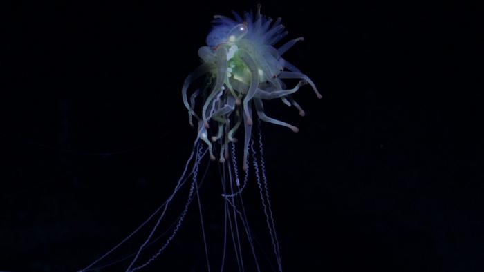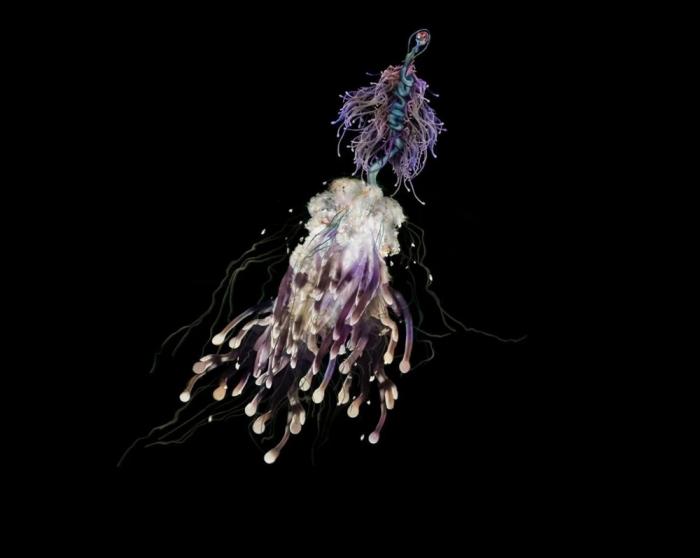 Чуть ниже расположены несколько нектофор. Выглядят они как толстые макаронины и отвечают за движение всей колонии. Нектофоры сокращаются по принципу зонтика — открываются и закрываются, захватывая и выбрасывая воду, чем и обеспечивается движение. Конечно, на такой тяге сильно не разгонишься, поэтому батифизы не могут просто взять и уплыть куда-то. Всю жизнь они проводят в управляемом дрейфе по Атлантическому и Тихому океанам. При этом встречаются колонии только на большой глубине, от 1000 до 4000 метров. Там темно, холодно, да и плыть-то особо некуда