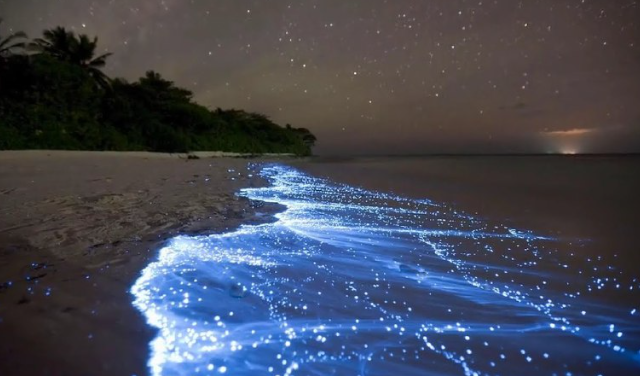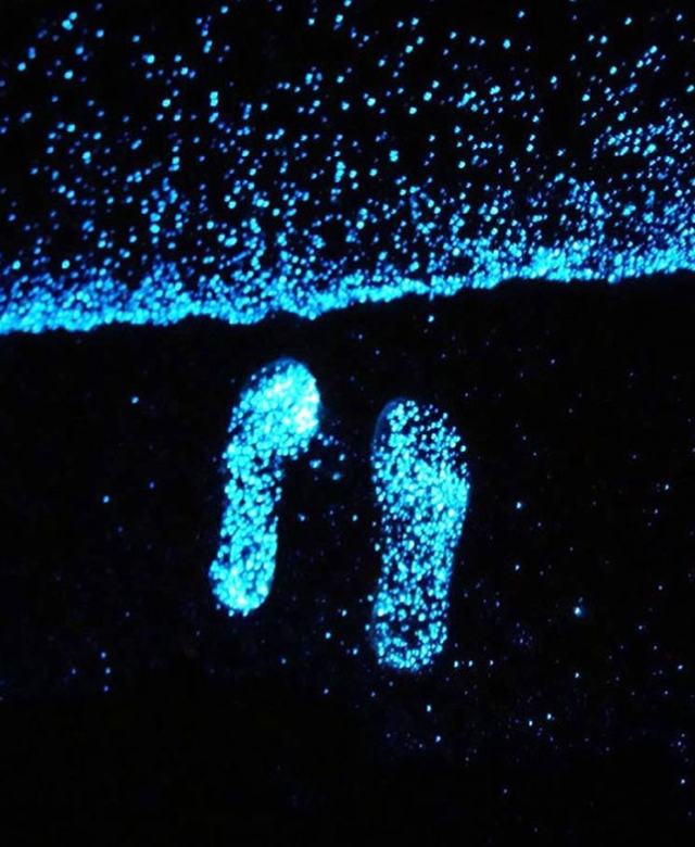 Свечение создают фитопланктон - крошечные плавающие организмы. В их клетках происходят особые химические реакции, вызывающие биолюминесценцию - природное светящееся явление. Когда вода вздрагивает - будь то от волн, прикосновения человека или проплывающей рыбы - планктон вспыхивает ярким неоновым светом.