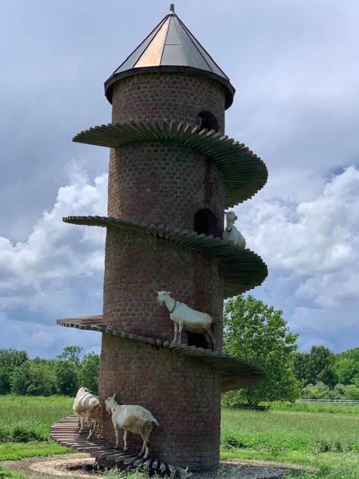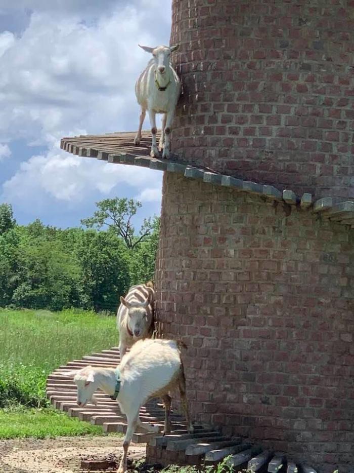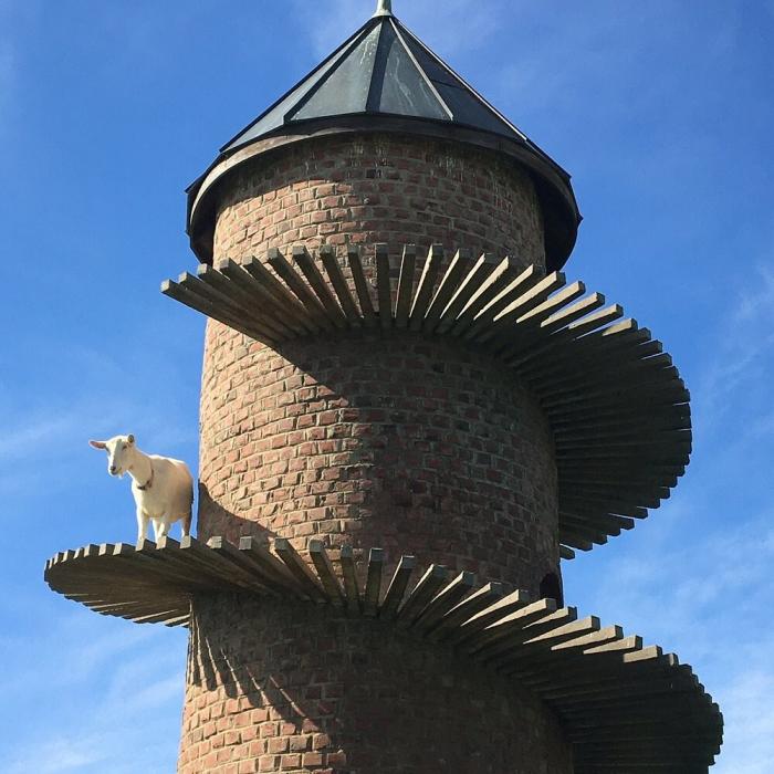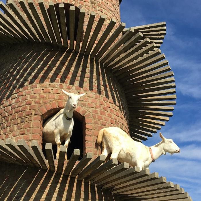 Их башня «Ба-Бука», сложенная из пяти тысяч кирпичей ручной работы, обвита спиралью из 276 ступеней. По этим ступеням козы поднимаются к своим личным «апартаментам» — уютным полым комнаткам внутри башни, где они проводят ночи.