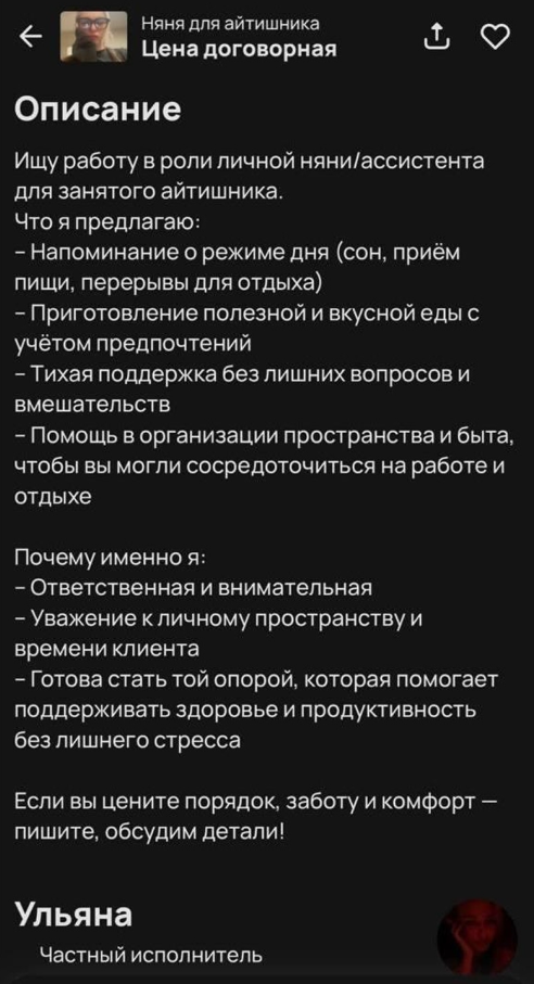 За деньги девушка обещает следить за режимом дня, напоминать о приеме пищи, помогать с готовкой, убирать квартиру и психологически поддерживать после напряжённых созвонов - чтобы программист мог полностью сосредоточиться на коде и дедлайнах.