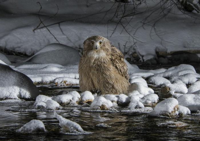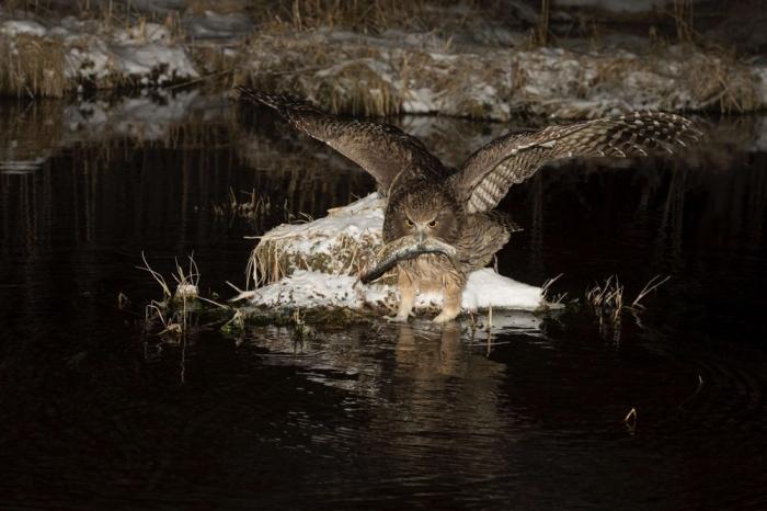 У пернатого хищника есть два основных способа охоты: Способ первый: пикирующий удар. Птица сидит на нависшей ветке и терпеливо высматривает добычу. Увидел рыбу — молниеносно пикирует, выхватывает её когтями из воды и взмывает обратно. При этом филин НИКОГДА не погружается в воду полностью — только лапы! Способ второй: бродячий рыбак. Филин заходит в воду по брюхо и, расставив полураскрытые крылья для баланса, медленно бродит по перекатам, нащупывая лапами рыб и раков на дне. Зрелище сюрреалистическое: огромная сова, размером с индюка, бредёт по мелководью, как цапля, и шарит лапами под камнями. После таких заплывов зимой перья могут обмерзнуть. И тогда филин не может взлететь. Поэтому этот способ харакерен для тёплых дней.