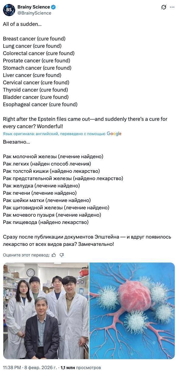 Новая неделя — новая теория заговора: сразу после выхода США из Всемирной Организации Здравоохранения неожиданно начали появляться «вакцины от всех видов рака и даже от ВИЧ». Испания, Южная Корея, Мексика, Вьетнам, Россия и другие страны одна за другой внезапно объявили о создании препаратов и вакцин, которые якобы способны побороть любой вид онкологии. Теперь в сети гадают: это совпадение или США блокировали разработки подобных препаратов ради выгоды фармбизнеса. По одной из версий, это делается специально, чтобы отвлечь внимание от Эпштейна...