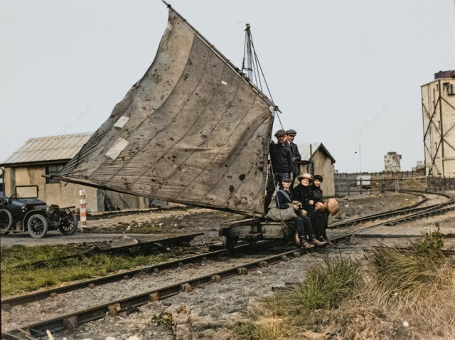 3. Группа мужчин едет по железнодорожным путям на вагонетке с парусным приводом в Сперн-Хед, Англия, 1922 год.