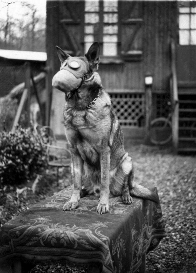 Собака, принадлежащая Французскому Красному Кресту, в противогазе, 1917 год