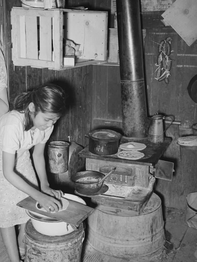 Счастливая мексиканская девочка делает тортильи и жарит их на дровяной плите в Робстауне, Техас, 1939 год