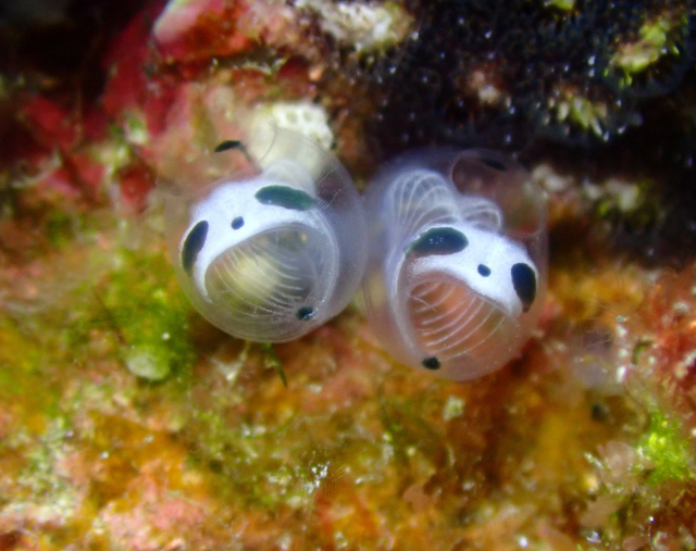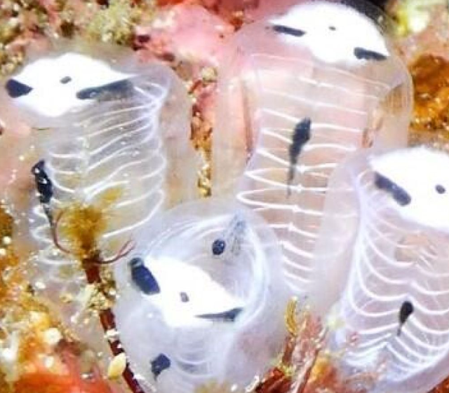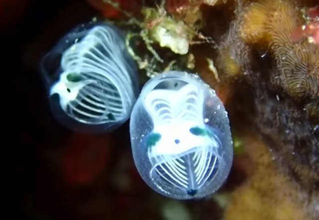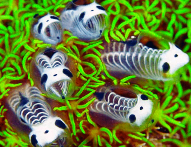 Скелетоподобное морское существо Clavelina ossipandae - прозрачный обитатель рифов с рёберными структурами и пятнами, напоминающими панду, создающими загадочный, словно оживший образ. Этот безвредный фильтратор воды встречается в Юго-Восточной Азии и играет важную роль в поддержании здоровья коралловых экосистем.