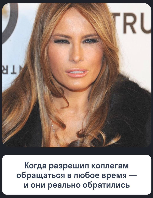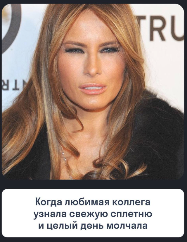 Мелания Трамп стала настоящим воплощением всех офисных работников - её мимика словно отражает каждую рабочую сцену. Особенно актуально после больших выходных, из которых мы с вами выходим.