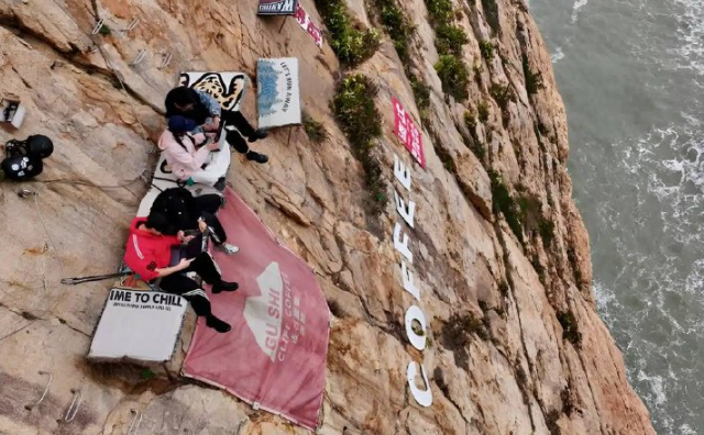 Кофейня в провинции Фуцзянь устроена прямо на отвесной скале и гордо зовёт себя «самой экстремальной в мире». Гости наслаждаются напитком на крошечной узкой доске с захватывающим видом на море. За 398 юаней (около 4400 рублей) здесь получают не только кофе, но и страховку, специальное снаряжение, а также услуги инструктора, который одновременно и гид, и официант, и фотограф.