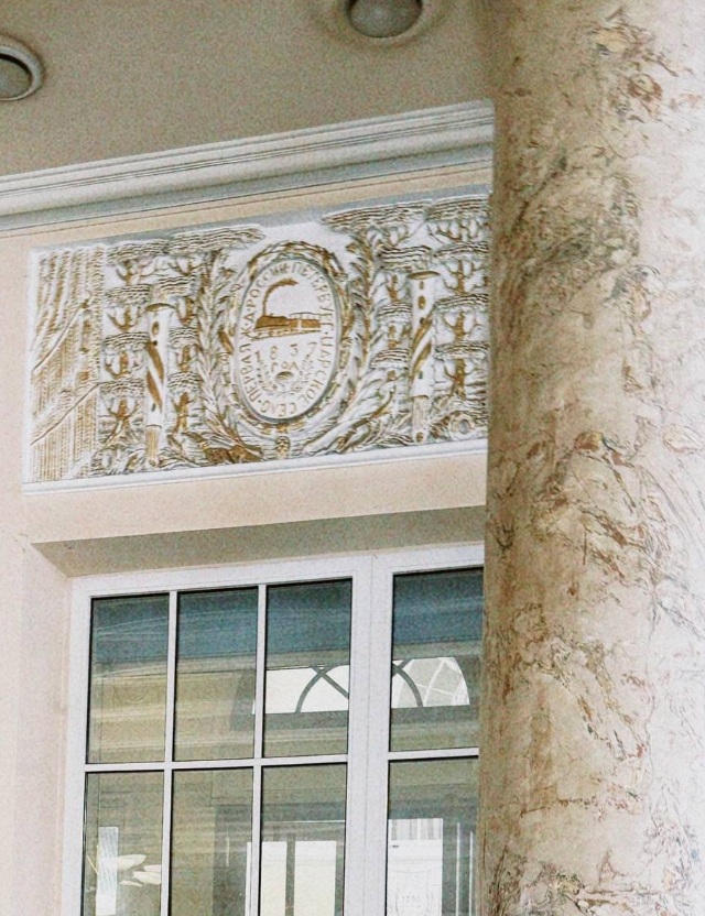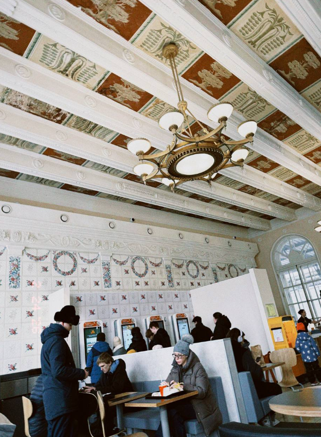 Фарфоровый декор «Вкусно и точка» появился в царскосельском филиале, открывшемся в здании железнодорожного вокзала в Пушкине. Уникальное панно с рельефным изображением цветочных гирлянд было изготовлено на заводе имени Ломоносова по чертежам знаменитого советского архитектора Левинсона.