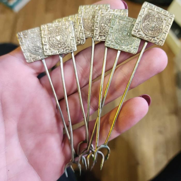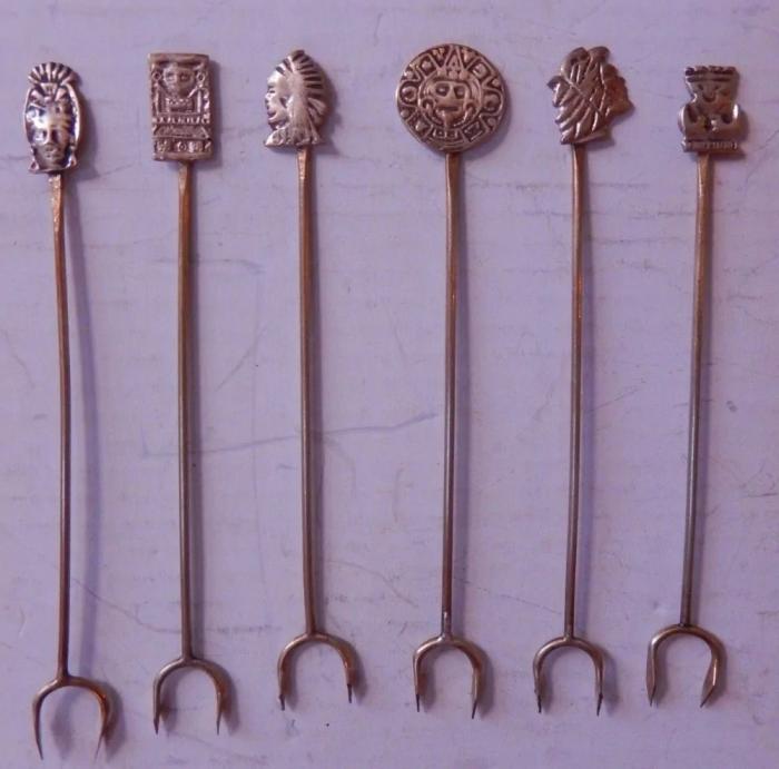 Набор коктейльных серебряных вилок с ацтекскими мотивами. Предназначены для таких закусок как маленькие кубики сыра, кусочки ананаса, оливки, десертов и т.д.