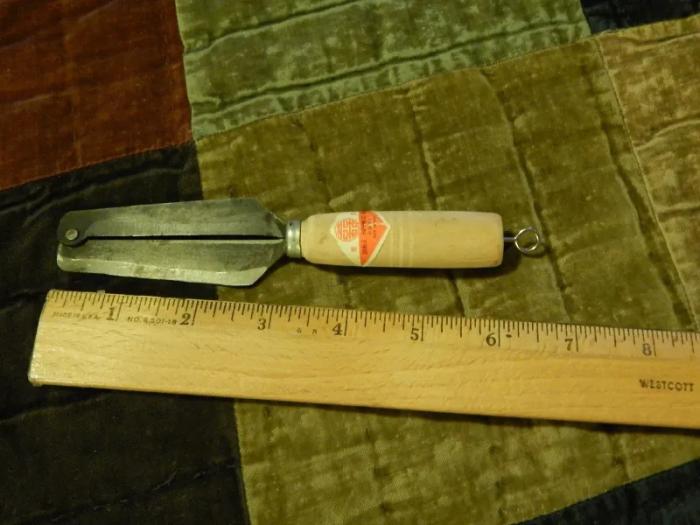 Старинная овощечистка. Может раскладываться и использоваться как нож или складываться как двусторонняя овощечистка.