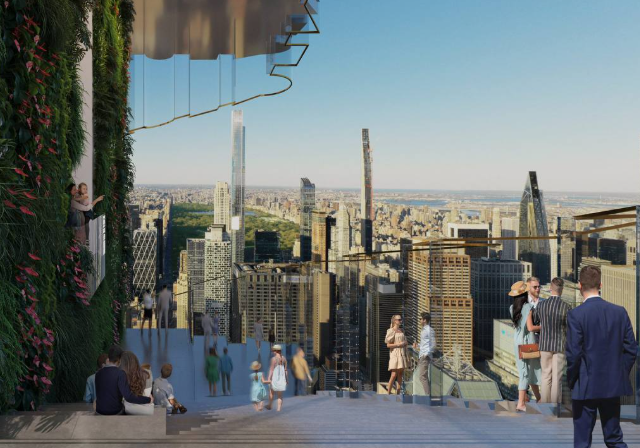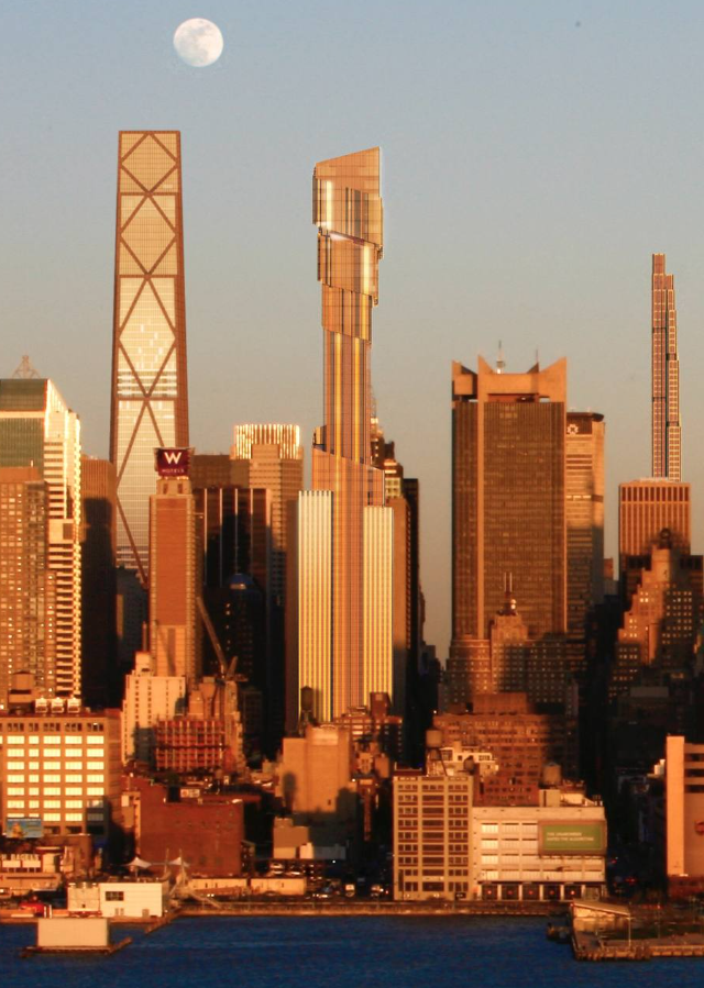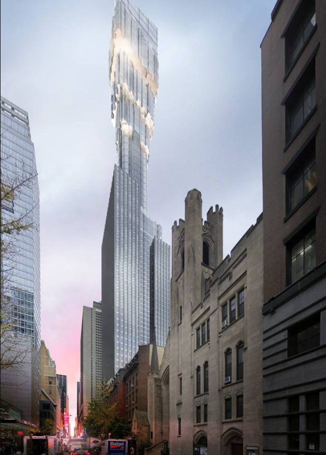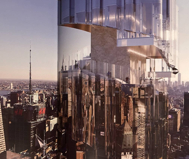 В Мидтауне Манхэттена строят еще один необычный небоскреб - 325-метровую башню The Torch. Проект на 52 этажа разместится на 8-й авеню и станет гостиничным комплексом примерно на 800 номеров с магазинами и ресторанами. Главная особенность здания - смотровая площадка на вершине с аттракционом свободного падения: посетителей будут поднимать внутри «факела» и затем опускать вниз в прозрачной капсуле. Архитектура башни вдохновлена факелом Статуи Свободы и должна заметно изменить силуэт района Таймс-сквер. Завершить строительство небоскреба планируют примерно к 2027 году.