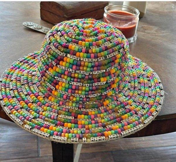 Шляпа с бисером и текстом песни Smash Mouth. Эта та, которая «Somebody once told me…»
