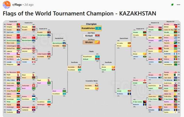 Флаг Казахстана признали самым красивым в мире — на Reddit прошло масштабное голосование среди флагов всех стран, в котором уверенно победил казахстанский. В финальный топ также вошли Кирибати, Бутан и Сейшелы.
