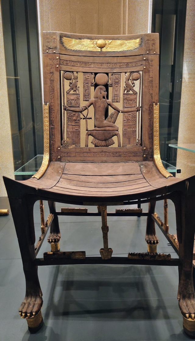 17. Позолоченное деревянное кресло Тутанхамона с резным изображением Хе, древнего бога бесконечности и нескончаемого времени
