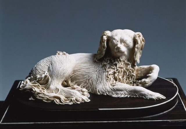11. Скульптура собаки из слоновой кости на шкатулке из чёрного дерева, XVII век н.э., в настоящее время находится в Музее серебра Палаццо Питти во Флоренции, Италия