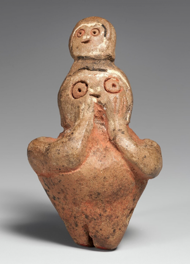 Над головой человека ребёнок, выглядит так, как будто его несут на плечах. Культура куписнике, 200-500 гг. до н.э., ныне хранится в музее Метрополитен.