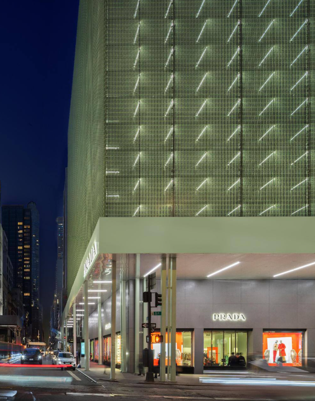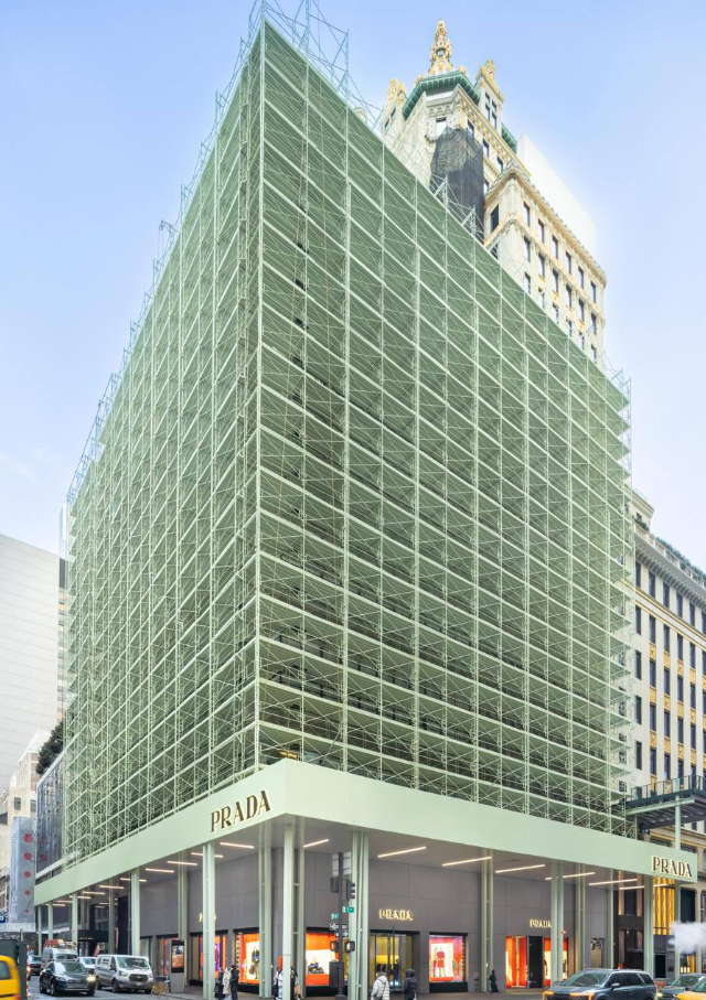 Итальянский модный дом Prada создал оригинальную арт?инсталляцию на фасаде своего флагманского бутика на Пятой авеню в Нью?Йорке. Вместо обычной защитной сетки над строительными лесами повсюду развешан тщательно продуманный графический узор, визуально преображающий стройплощадку. Эта художественная «маскировка» не только скрывает ремонт, но и превращает улицу в часть эстетического эксперимента. Проект уже привлёк внимание прохожих и модного сообщества как успешный пример интеграции дизайна в городскую среду.