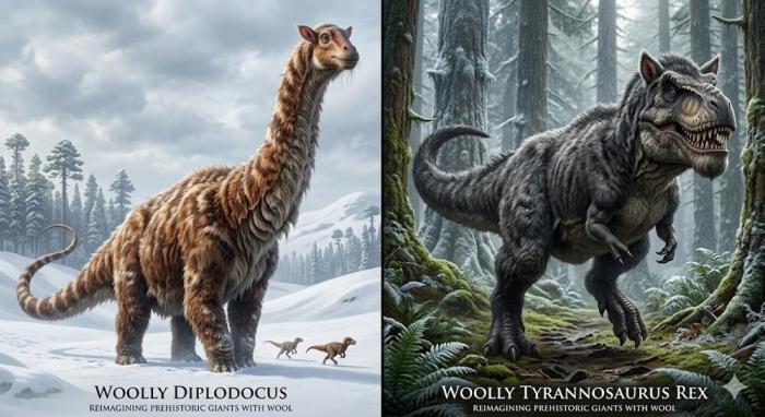 Мы тут немного пофантазировали на тему, а что, если бы и у других динозавров было бы утепление в виде шерсти или пушистых перьев. Получилось как-то так.