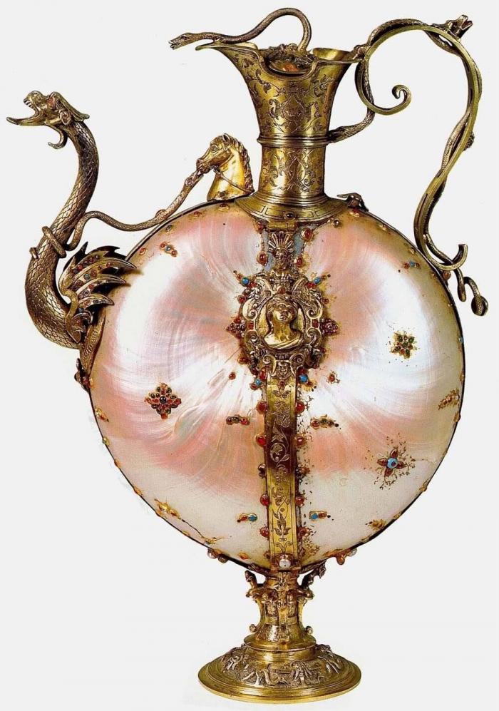 7. Кувшин, оправленный в серебро с позолотой и украшенный перламутром, рубинами и бирюзой. Около 1590 г. н.э.