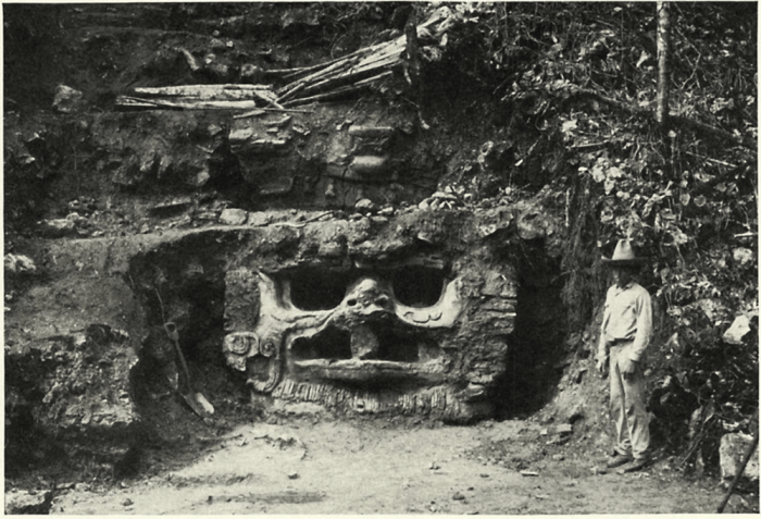 5. Фотография 1935 года, на которой изображена большая маска на пирамидальном сооружении в древнем городе майя Пьедрас-Неграс в Гватемале
