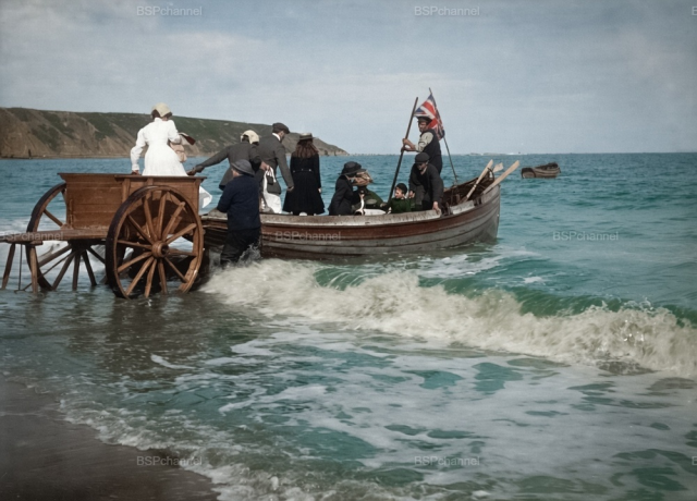 9. Семья пересаживается с тележки в прибрежную гребную лодку на английском пляже, около 1900 года.