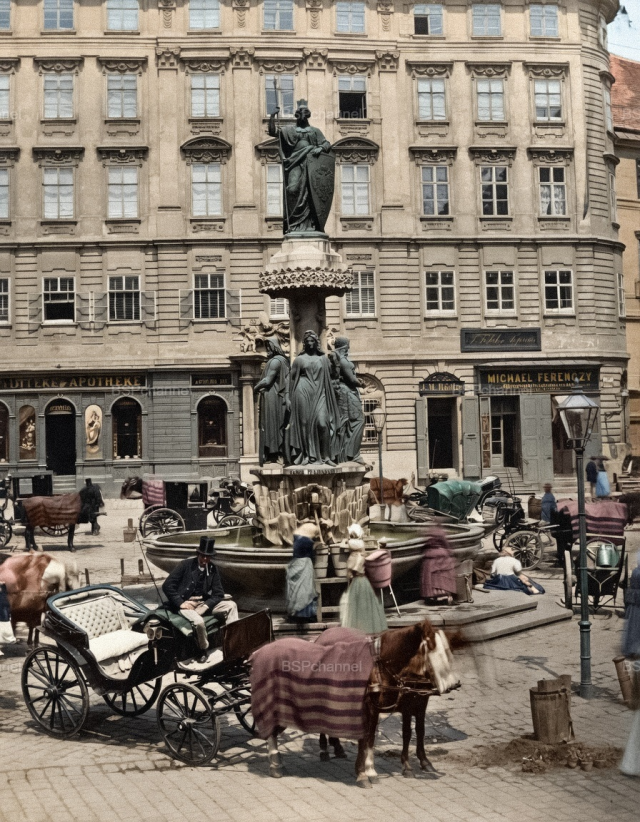 20. Конный экипаж возле фонтана на площади Фрайунг, Вена, Австрия, 1860-1890 год.