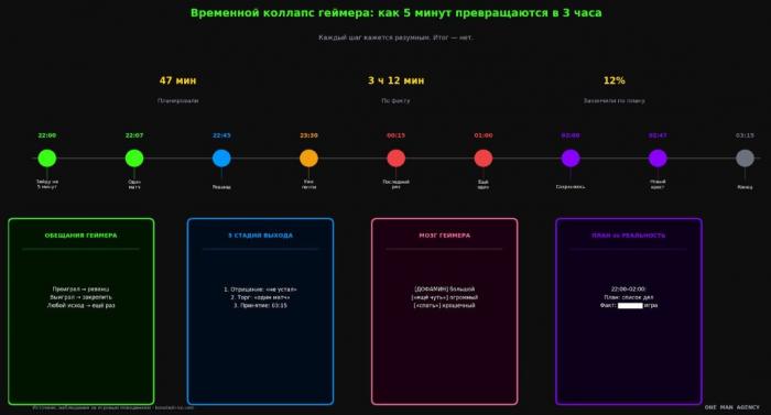 После: Закрыл игру в 3:15. Лёг. Мозг продолжает прокручивать стратегию следующего матча, анализировать ошибки, строить планы на следующую сессию. Через 20 минут наконец засыпает.