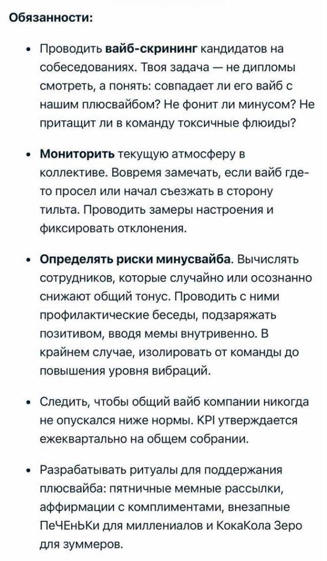 Специалиста по «плюс-вайбу» с зарплатой от 150.000? ищут в Москве. В бонусах — сеансы с психотерапевтом и ретриты. В обязанности входит: делать рассылки с мемами, выявлять источники «минус-вайба» и заряжать сотрудников позитивом. Ну вот, а говорите хорошей работы нет!