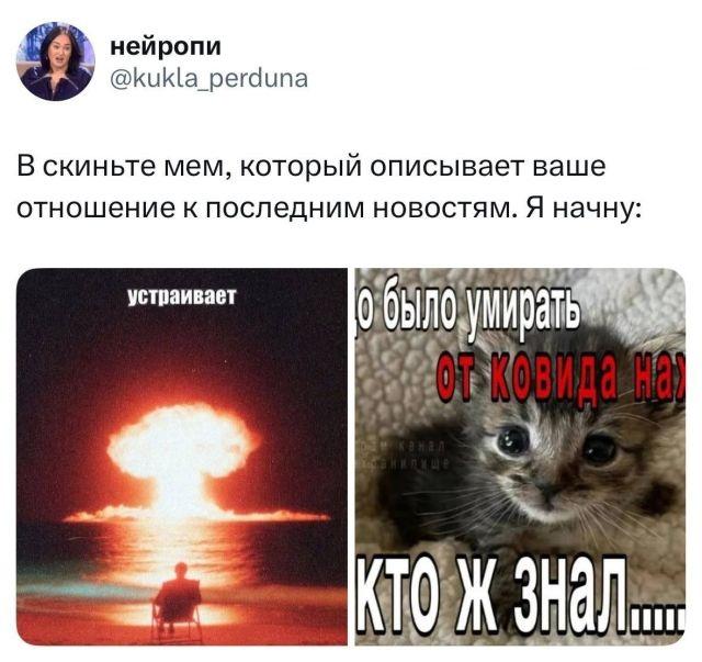 Чего греха таить, новостная повестка в последние недель такая лютая, что тут никакой пустырник с магнием не поможет. Но Интернет, который сейчас переживает не лучшие дни - это место единения. Как говорится, ничто так не сплачивает как общий трындец. Чтобы поднять друг другу настроение, Твиттерские устроили марафон мемов, которые описывают наше состояние в последнее время.