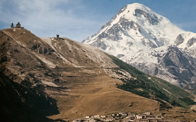 Вид на вершину Казбека с Военно-Грузинской дороги в районе села Казбеги. Грузинская ССР, 1970 год.