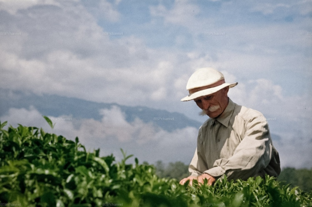 Столетний житель села работает на сельской чайной плантации. Абхазская АССР. Село Лыхны Гудаутского района, 1967 год.