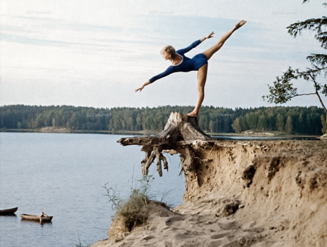 Гимнастка делает "ласточку", стоя на краю берегового обрыва в молодежном спортивном лагере под Москвой, 1965 год.
