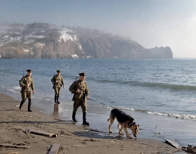 Пограничный наряд с собакой идет по берегу океана. СССР. Камчатка,1968 год.
