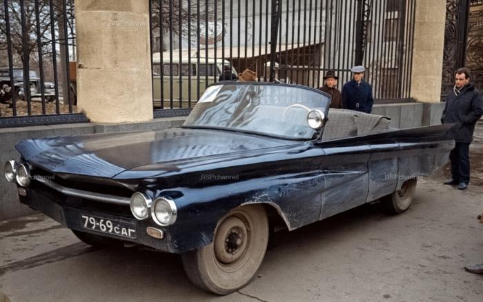 Автомобиль, построенный слесарем опытного подшипникового завода Николаем Цыпцыным, участвовавший в параде самодельной авто- и мототехники в Москве, 1967 год.