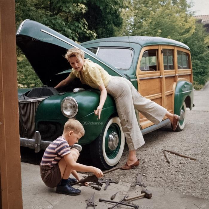 Ремонт автомобиля Ford Super Deluxe "Woodie"всей семьей, 1940-е