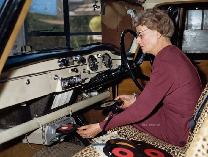 Миссис Батт вставляет пластинку в переднюю панель своего автомобильного проигрывателя. Музыка подается на акустическую систему автомобильной магнитолы, 1960 год.