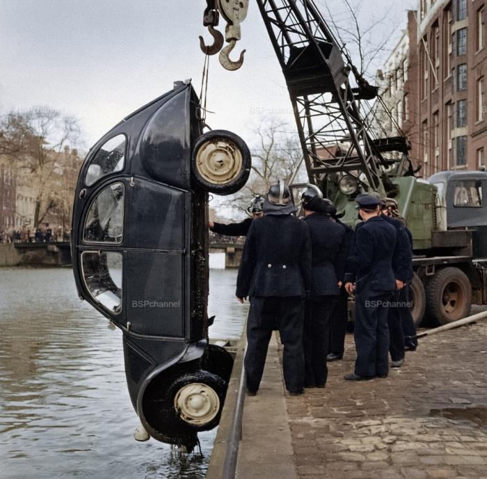 Спецслужбы поднимают Citro?n 2CV из канала в Амстердаме, 1961 год.
