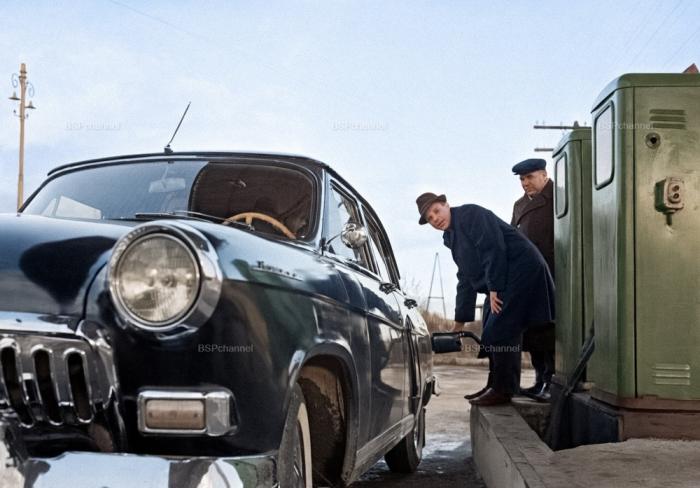 Летчик-космонавт СССР Юрий Гагарин на придорожной автомобильной заправочной станции по дороге в Гжатск (Гагарин), 1966 год.