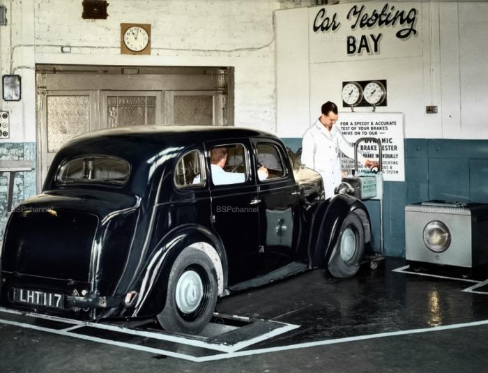 Тормоза автомобиля проверяются в современном испытательном стенде в гараже в Тиссайде, 18 августа 1960 года.