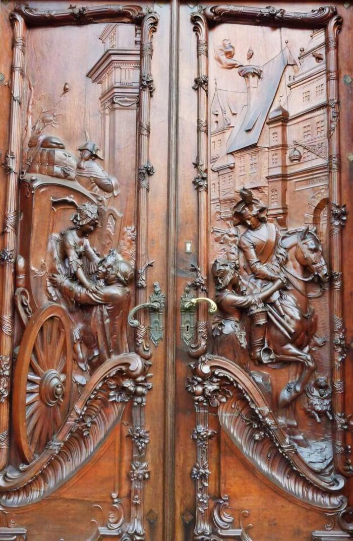 5. Деревянная дверь с замысловатой резьбой, расположенная у входа в музей Кунстхаус Хайльсхоф в Вормсе, Германия