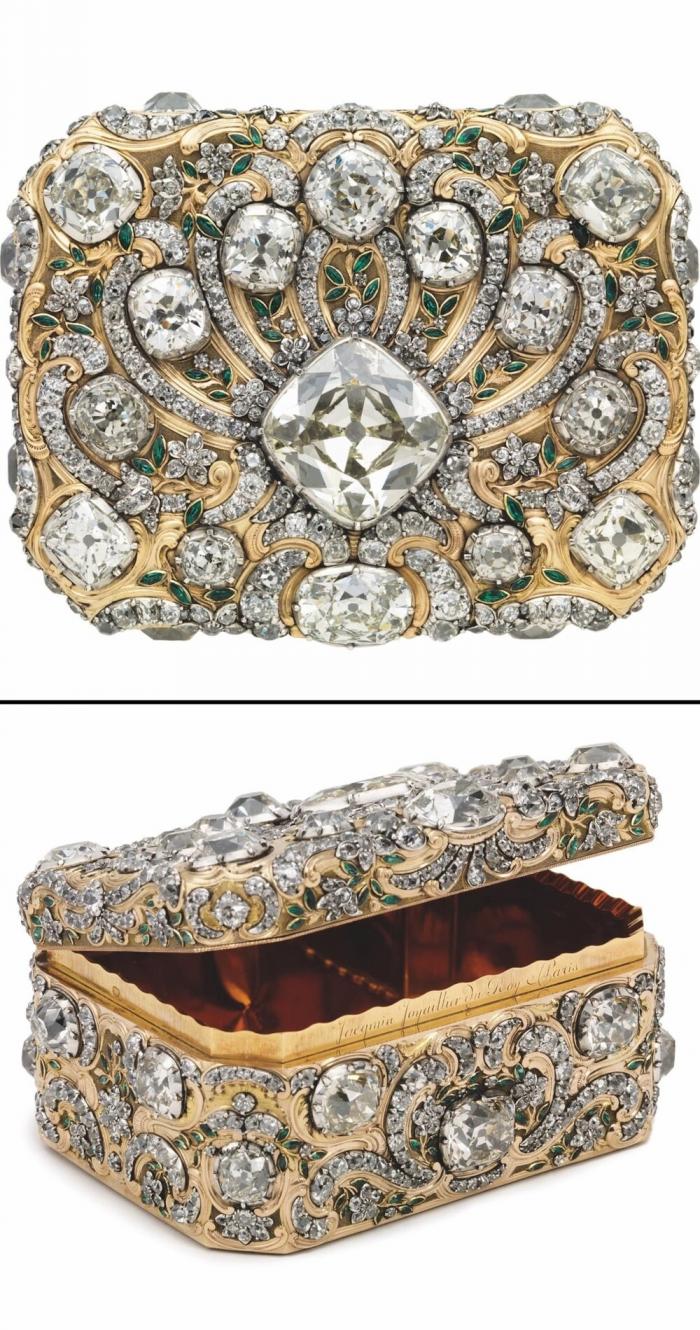 9. Табакерка с бриллиантами короля Португалии Жозе, изготовленная Пьером Андре Жакменом (1720-1773 гг. н.э.), мастером-ювелиром французского короля Людовика XV